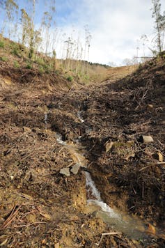 Además, los eucaliptales se talan por matarrasa cada 12 años, el turno más corto entre las especies forestales de nuestro entorno. En el caso del eucalipto, la corta mecanizada requiere de una red muy densa de vías de saca para poder llegar a cada árbol. Las pistas, junto a las matarrasas tan frecuentes, fomentan la pérdida de suelo y el enturbiamiento de los ríos. Así, cada vez que se talan los árboles, la capa superficial del suelo es arrastrada por las lluvias y acaba en los ríos, afectando negativamente a su biota.